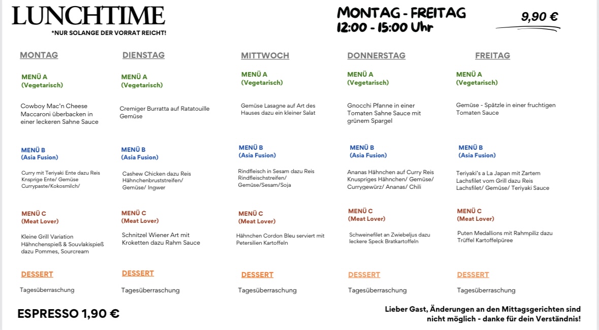 Ob knackige Salate, Asiatische Speisen, saftige Fleischgerichte oder vegetarische Köstlichkeiten – bei uns findest Du für jeden Geschmack das Richtige. Dabei legen wir großen Wert auf die Verwendung regionaler und saisonaler Zutaten, um Ihnen stets höchste Qualität zu garantieren.